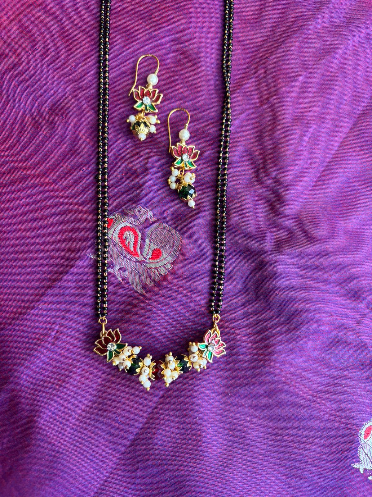 This stunning mangalsutra set features a beautifully crafted floral arrangement with lotus-shaped enamel charms, delicate pearl clusters, and sparkling green stones, creating a graceful blend of tradition and elegance.