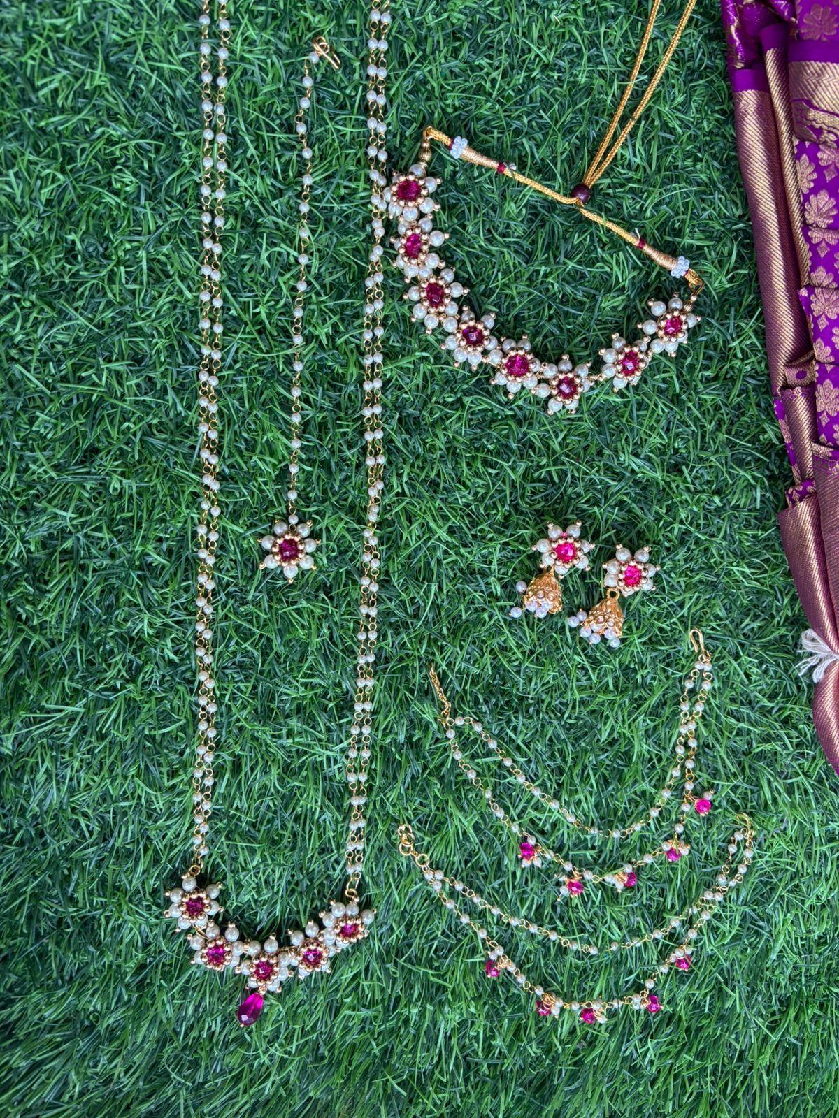 This stunning handcrafted jewelry set features an elegant combination of ruby pink stones, white pearls, and gold-finish detailing, making it perfect for brides and festive occasions.